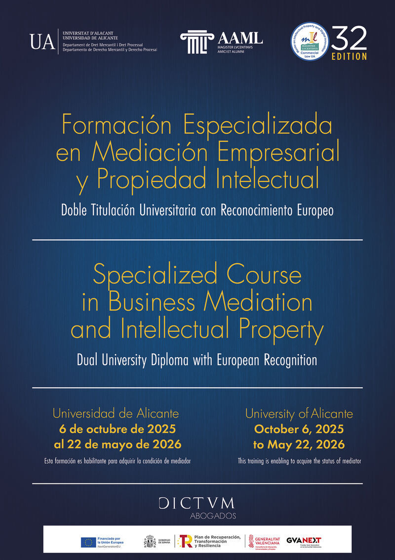 Continúa Abierta la inscripción del Programa de Doble Titulación Universitaria en Mediación Empresarial y en Propiedad Intelectual, organizado por el Área de Derecho Mercantil de la UA – Universidad de Alicante / Universitat d’Alacant .