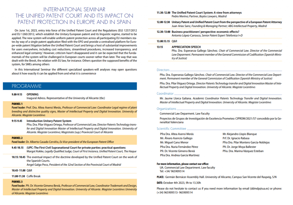 Tenemos el placer de informar que el próximo 4 de Octubre de 2023 tendrá lugar el seminario internacional: «The Unified Patent Court and its Impact on Patent Protection in Europe and Spain».