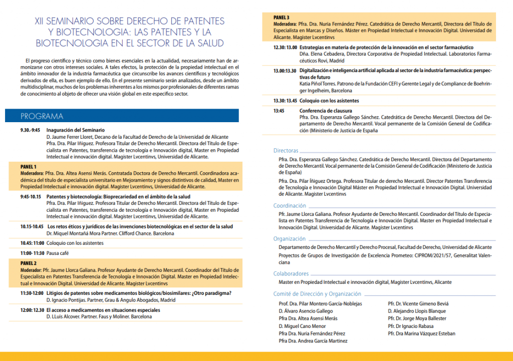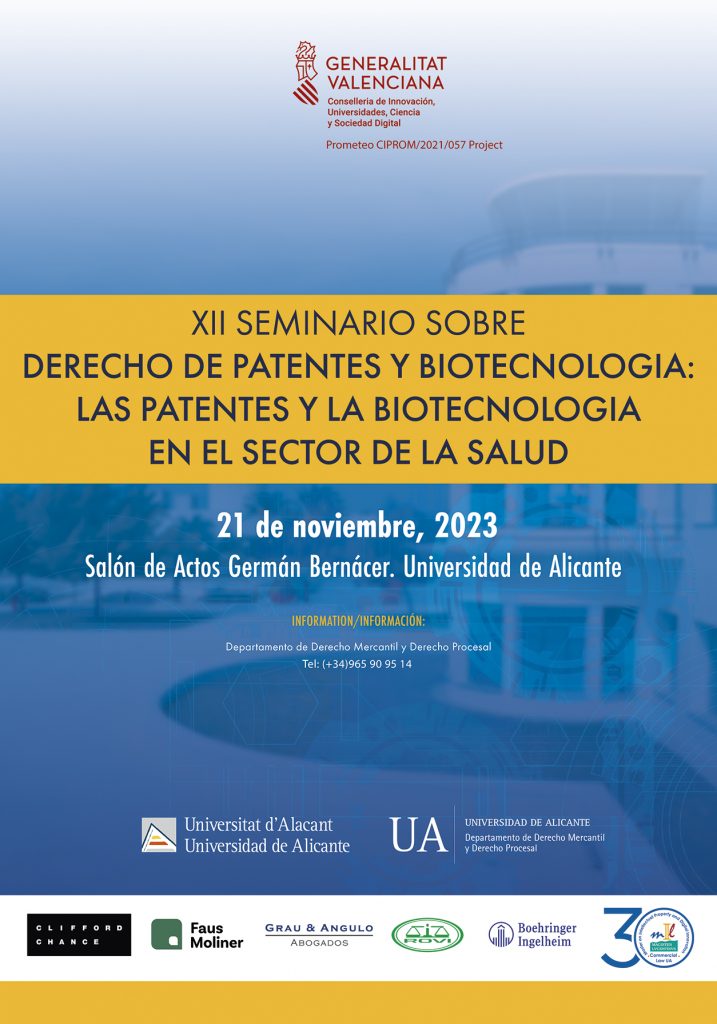 Desde el Departamento de Derecho Mercantil de la Universidad de Alicante tenemos el placer de informar de la celebración del «XII SEMINARIO SOBRE DERECHO DE PATENTES Y BIOTECNOLOGÍA: LAS PATENTES Y LA BIOTECNOLOGÍA EN EL SECTOR DE LA SALUD». El seminario tendrá lugar el día 21 de Noviembre de 10 a 14 horas en el Salón de Actos del Edificio Germán Bernácer de la Universidad de Alicante. Se trata de un seminario en formato híbrido, que puede seguirse tanto en la Universidad como a través de un enlace que estará operativo desde el día anterior, Lunes, 20 de Noviembre.